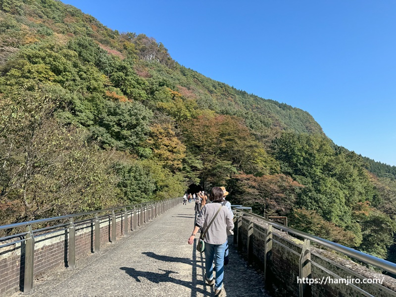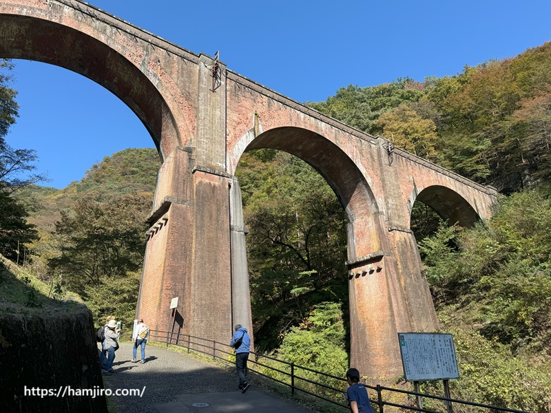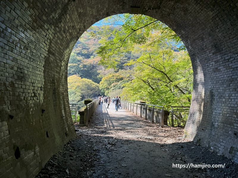 約6㎞のコースには、旧丸山変電所や6つの橋梁、10の隧道(トンネル)、そして有名な「めがね橋」など歴史的な鉄道施設が多数残っており、鉄道遺産を間近に見ながら自然豊かな峠の風景を楽しめるハイキングコースになっています。