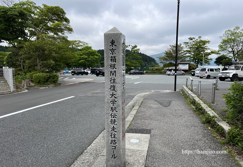 箱根駅伝 往路ゴール石碑の奥にはP12駐車場。
