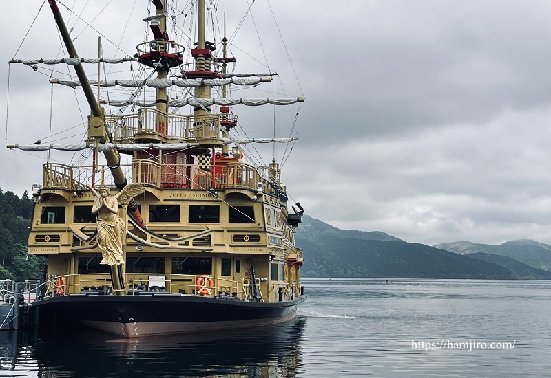 芦ノ湖海賊船 クイーン芦ノ湖。就航は2019年4月で比較的新しく、ゴールドの船体は一際目を引く。P12駐車場に船の発着所あり。
