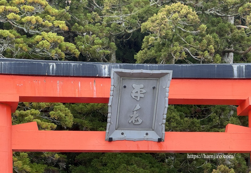 後日スワンボートに乗り撮った扁額。湖上からは、平和の鳥居の混雑を避け優越感に浸れるおすすめ観光。