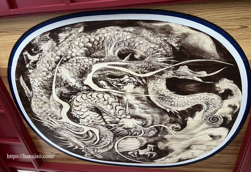 天井一面に水墨画の迫力がある守護神の九頭龍。口から出ている息吹がまるで生きているような表現されていて水墨と相性がいい。