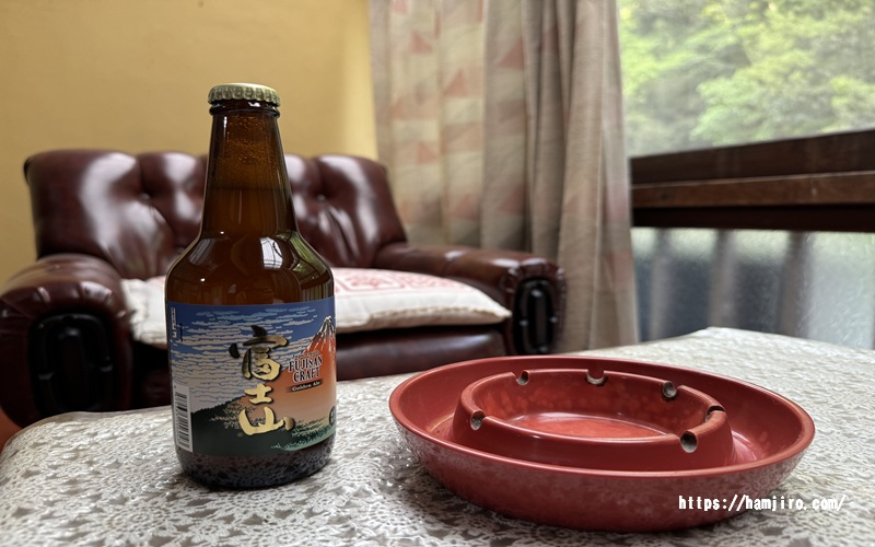 縁側で川のせせらぎをBGMにしながら地ビールをゴクリ。至福の一杯!タバコは吸わないが懐かしい形の灰皿