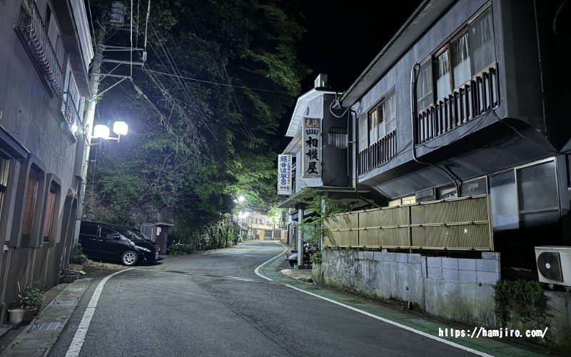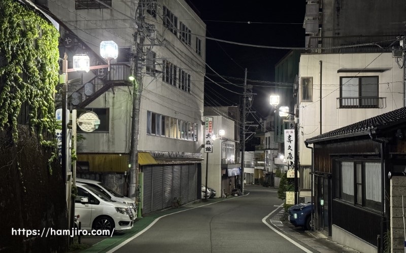 静寂に包まれる温泉街と昭和レトロ宿の一夜