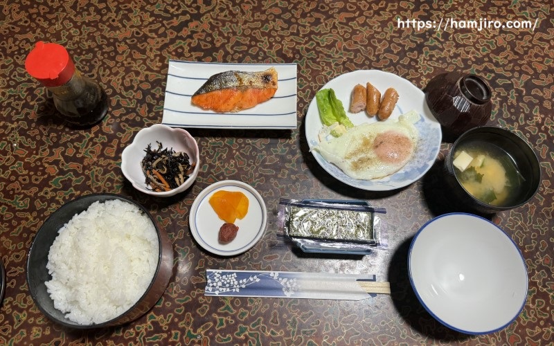 朝食も部屋食で、定番のおかずが並びます。